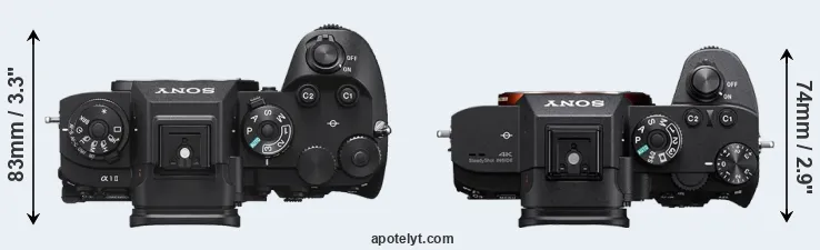 An illustration of the physical size and weight of the Sony A1 II and the Sony A7R III is provided in the side-by-side display below. The two cameras are presented according to their relative size. Three successive views from the front, the top, and the rear are shown. All width, height and depth dimensions are rounded to the nearest millimeter.