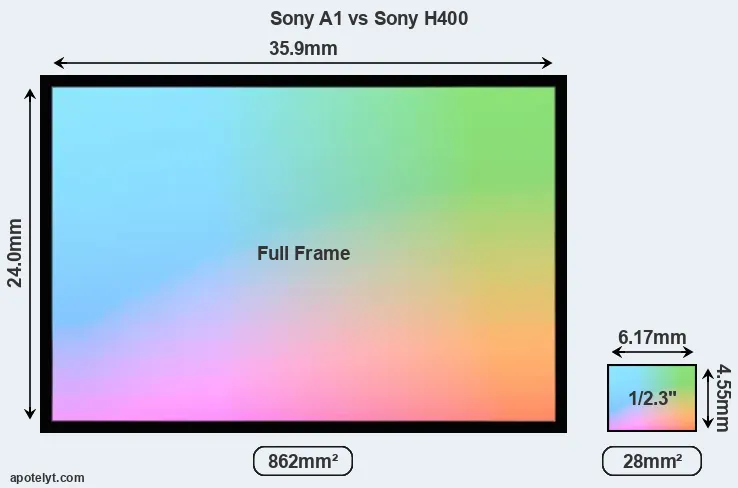 Of the two cameras under consideration, the Sony A1 features a full frame sensor and the Sony H400 a 1/2.3-inch sensor. The sensor area in the H400 is 97 percent smaller. As a result of these sensor size differences, the cameras have a format factor of, respectively, 1.0 and 5.6. The sensor in the A1 has a native 3:2 aspect ratio, while the one in the H400 offers a 4:3 aspect.