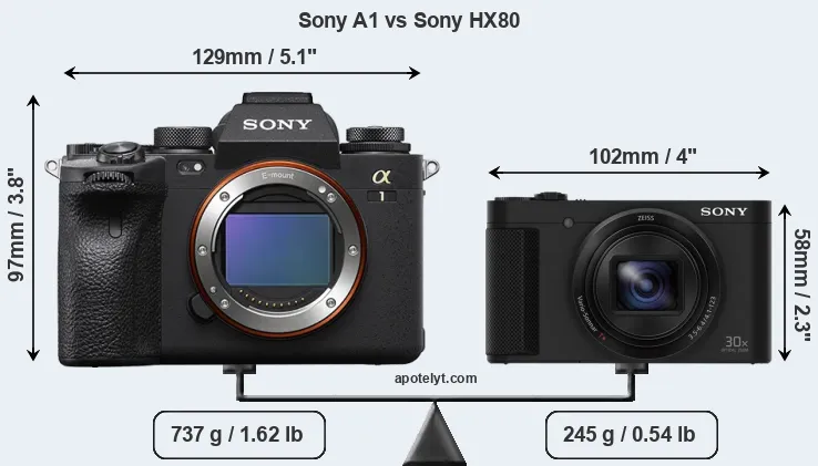 If the front view area (width x height) of the cameras is taken as an aggregate measure of their size, the Sony HX80 is considerably smaller (53 percent) than the Sony A1. It is worth mentioning in this context that the A1 is splash and dust resistant, while the HX80 does not feature any corresponding weather-sealing.