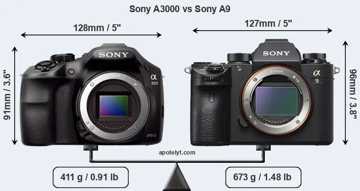 If the front view area (width x height) of the cameras is taken as an aggregate measure of their size, the Sony A9 is somewhat larger (5 percent) than the Sony A3000. Moreover, the A9 is substantially heavier (64 percent) than the A3000. It is noteworthy in this context that the A9 is splash and dust-proof, while the A3000 does not feature any corresponding weather-sealing.