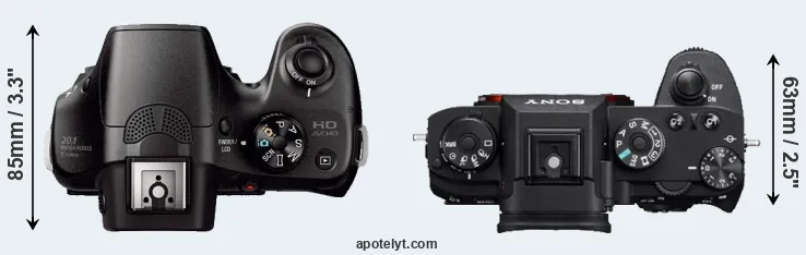 The side-by-side display below illustrates the physical size and weight of the Sony A3000 and the Sony A9. The two cameras are presented according to their relative size. Three successive views from the front, the top, and the rear are shown. All width, height and depth dimensions are rounded to the nearest millimeter.