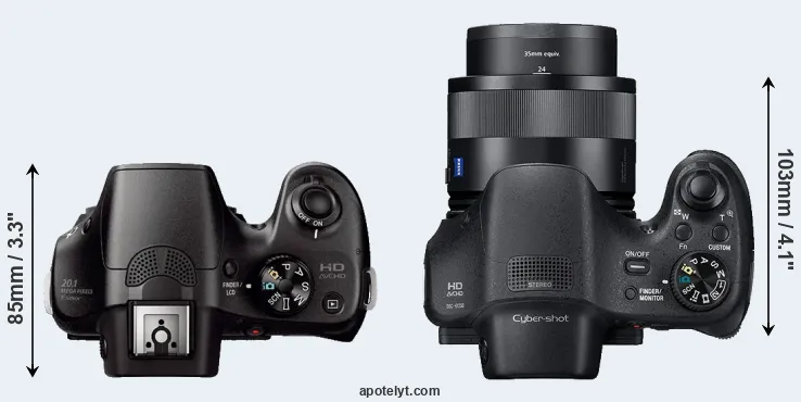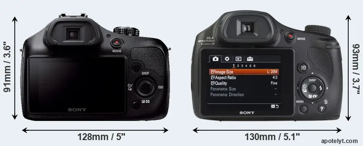 The side-by-side display below illustrates the physical size and weight of the Sony A3000 and the Sony HX350. The two cameras are presented according to their relative size. Three consecutive views from the front, the top, and the rear side are shown. All width, height and depth dimensions are rounded to the nearest millimeter.