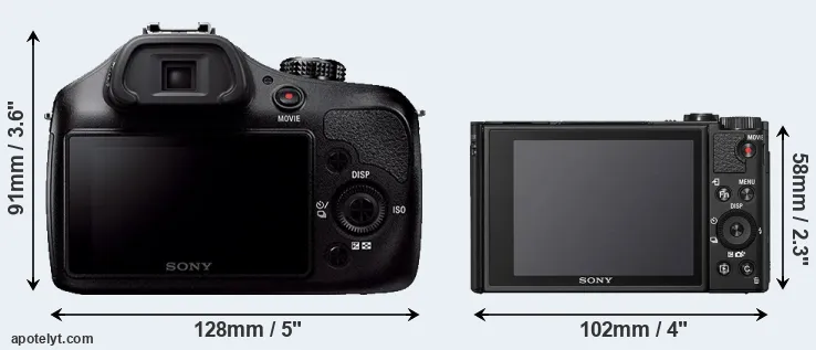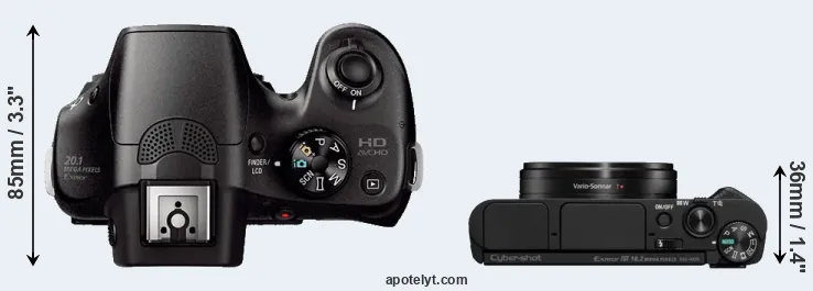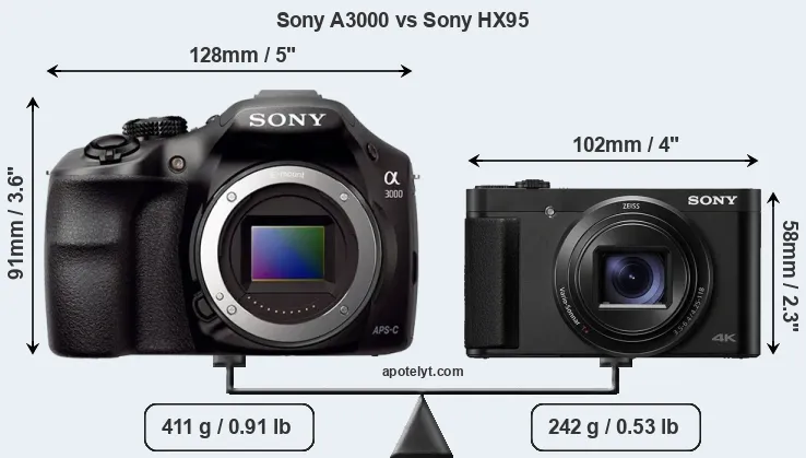 The side-by-side display below illustrates the physical size and weight of the Sony A3000 and the Sony HX95. The two cameras are presented according to their relative size. Three successive views from the front, the top, and the rear are shown. All width, height and depth measures are rounded to the nearest millimeter.