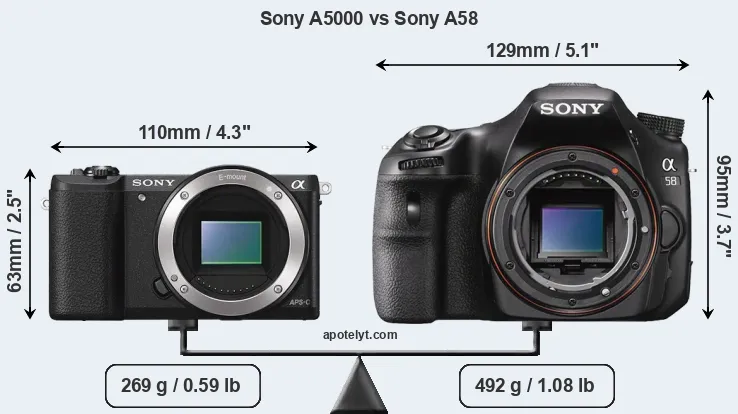 If the front view area (width x height) of the cameras is taken as an aggregate measure of their size, the Sony A58 is considerably larger (77 percent) than the Sony A5000. Moreover, the A58 is substantially heavier (83 percent) than the A5000. In this context, it is worth noting that neither the A5000 nor the A58 are weather-sealed.