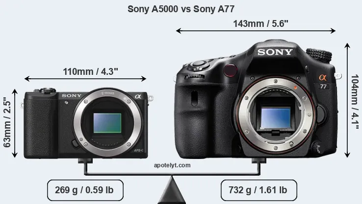 If the front view area (width x height) of the cameras is taken as an aggregate measure of their size, the Sony A77 is considerably larger (115 percent) than the Sony A5000. Moreover, the A77 is substantially heavier (172 percent) than the A5000. It is noteworthy in this context that the A77 is splash and dust-proof, while the A5000 does not feature any corresponding weather-sealing.