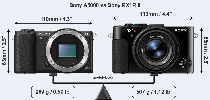 The physical size and weight of the Sony A5000 and the Sony RX1R II are illustrated in the side-by-side display below. The two cameras are presented according to their relative size. Three successive views from the front, the top, and the rear are shown. All width, height and depth measures are rounded to the nearest millimeter.