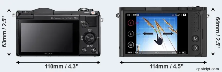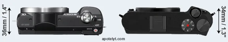 The side-by-side display below illustrates the physical size and weight of the Sony A5000 and the YI M1. The two cameras are presented according to their relative size. Three successive views from the front, the top, and the rear are shown. All width, height and depth dimensions are rounded to the nearest millimeter.