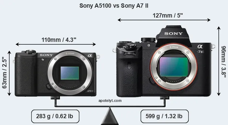 If the front view area (width x height) of the cameras is taken as an aggregate measure of their size, the Sony A7 II is considerably larger (76 percent) than the Sony A5100. Moreover, the A7 II is substantially heavier (112 percent) than the A5100. It is noteworthy in this context that the A7 II is splash and dust-proof, while the A5100 does not feature any corresponding weather-sealing.