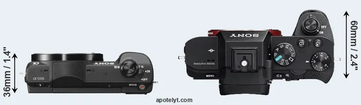 The physical size and weight of the Sony A5100 and the Sony A7 II are illustrated in the side-by-side display below. The two cameras are presented according to their relative size. Three consecutive views from the front, the top, and the rear side are shown. All size dimensions are rounded to the nearest millimeter.