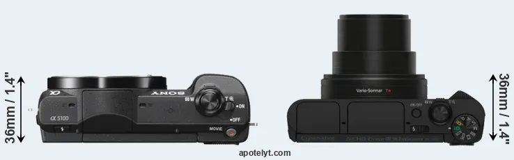 The physical size and weight of the Sony A5100 and the Sony HX80 are illustrated in the side-by-side display below. The two cameras are presented according to their relative size. Three consecutive views from the front, the top, and the rear side are shown. All width, height and depth dimensions are rounded to the nearest millimeter.