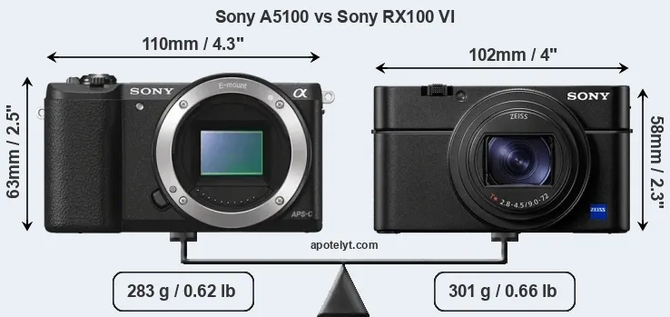 An illustration of the physical size and weight of the Sony A5100 and the Sony RX100 VI is provided in the side-by-side display below. The two cameras are presented according to their relative size. Three successive views from the front, the top, and the rear are shown. All width, height and depth measures are rounded to the nearest millimeter.