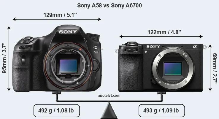 The physical size and weight of the Sony A58 and the Sony A6700 are illustrated in the side-by-side display below. The two cameras are presented according to their relative size. Three consecutive perspectives from the front, the top, and the back are available. All width, height and depth dimensions are rounded to the nearest millimeter.