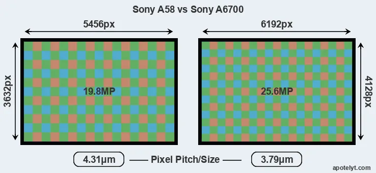 While the two cameras under review share the same sensor size, the A6700 offers a higher resolution of 25.6 megapixels, compared with 19.8 MP of the A58. This megapixels advantage translates into a 13 percent gain in linear resolution. On the other hand, these sensor specs imply that the A6700 has a higher pixel density and a smaller size of the individual pixel (with a pixel pitch of 3.79μm versus 4.31μm for the A58). However, it should be noted that the A6700 is much more recent (by 10 years and 4 months) than the A58, and its sensor will have benefitted from technological advances during this time that compensate for the smaller pixel size.