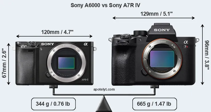 If the front view area (width x height) of the cameras is taken as an aggregate measure of their size, the Sony A7R IV is considerably larger (54 percent) than the Sony A6000. Moreover, the A7R IV is substantially heavier (93 percent) than the A6000. It is noteworthy in this context that the A7R IV is splash and dust-proof, while the A6000 does not feature any corresponding weather-sealing.