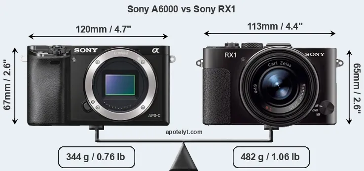 The Sony Alpha A6000 and the Sony Cyber-shot DSC-RX1 are two digital cameras that were announced, respectively, in February 2014 and September 2012. The A6000 is a mirrorless interchangeable lens camera, while the RX1 is a fixed lens compact. The cameras are based on an APS-C (A6000) and a full frame (RX1) sensor. Both cameras offer a resolution of 24 megapixels.