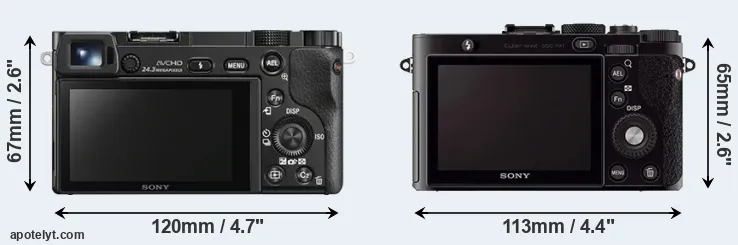 The side-by-side display below illustrates the physical size and weight of the Sony A6000 and the Sony RX1. The two cameras are presented according to their relative size. Three successive views from the front, the top, and the rear are shown. All size dimensions are rounded to the nearest millimeter.
