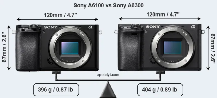 In this particular case, the Sony A6100 and the Sony A6300 have exactly the same width and height, and, thus, have identically-sized bodies. However, the A6300 is slightly heavier (2 percent) than the A6100. It is noteworthy in this context that the A6300 is splash and dust-proof, while the A6100 does not feature any corresponding weather-sealing.