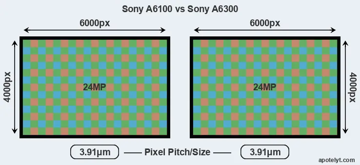 The two cameras under review do not only share the same sensor size, but also offer an identical resolution of 24 megapixels. This similarity in sensor specs implies that both the A6100 and the A6300 have the same pixel density, as well as the same pixel size. It should, however, be noted that the A6100 is much more recent (by 3 years and 6 months) than the A6300, and its sensor will have benefitted from technological advances during this time.
