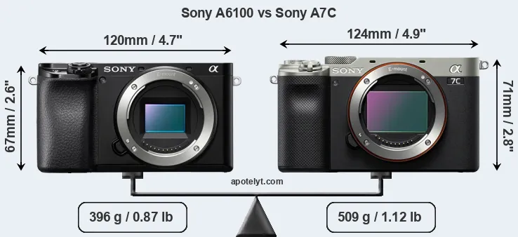 If the front view area (width x height) of the cameras is taken as an aggregate measure of their size, the Sony A7C is notably larger (10 percent) than the Sony A6100. Moreover, the A7C is markedly heavier (29 percent) than the A6100. It is noteworthy in this context that the A7C is splash and dust-proof, while the A6100 does not feature any corresponding weather-sealing.