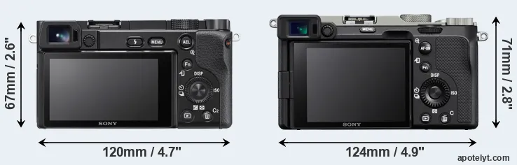 The side-by-side display below illustrates the physical size and weight of the Sony A6100 and the Sony A7C. The two cameras are presented according to their relative size. Three consecutive perspectives from the front, the top, and the back are available. All width, height and depth measures are rounded to the nearest millimeter.