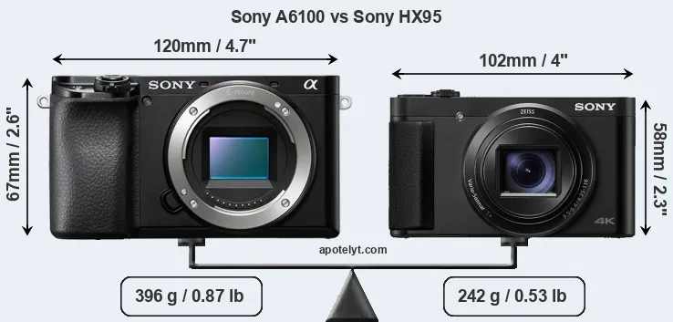 The physical size and weight of the Sony A6100 and the Sony HX95 are illustrated in the side-by-side display below. The two cameras are presented according to their relative size. Three successive views from the front, the top, and the rear are shown. All width, height and depth measures are rounded to the nearest millimeter.