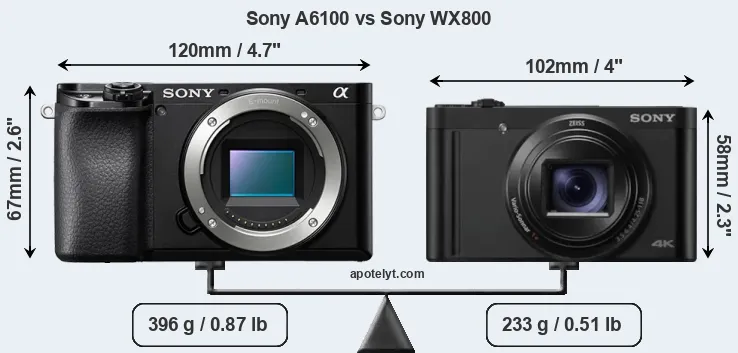 The physical size and weight of the Sony A6100 and the Sony WX800 are illustrated in the side-by-side display below. The two cameras are presented according to their relative size. Three successive views from the front, the top, and the rear are shown. All width, height and depth measures are rounded to the nearest millimeter.