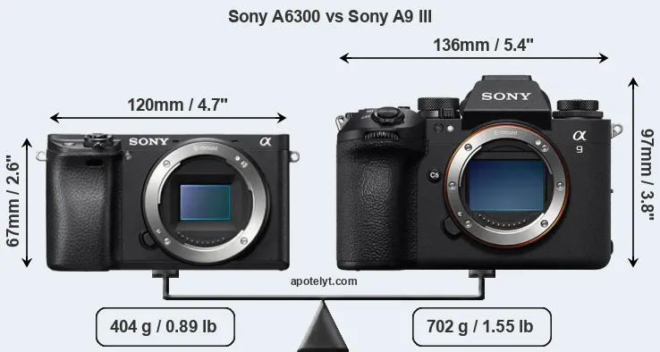 An illustration of the physical size and weight of the Sony A6300 and the Sony A9 III is provided in the side-by-side display below. The two cameras are presented according to their relative size. Three consecutive views from the front, the top, and the rear side are shown. All width, height and depth measures are rounded to the nearest millimeter.
