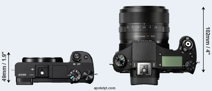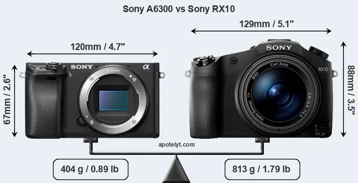 The physical size and weight of the Sony A6300 and the Sony RX10 are illustrated in the side-by-side display below. The two cameras are presented according to their relative size. Three consecutive perspectives from the front, the top, and the back are available. All width, height and depth dimensions are rounded to the nearest millimeter.
