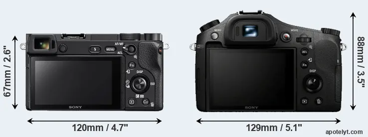 If the front view area (width x height) of the cameras is taken as an aggregate measure of their size, the Sony RX10 is notably larger (41 percent) than the Sony A6300. In this context, it is worth noting that both cameras are splash and dust-proof and can, hence, be used in inclement weather conditions or harsh environments.