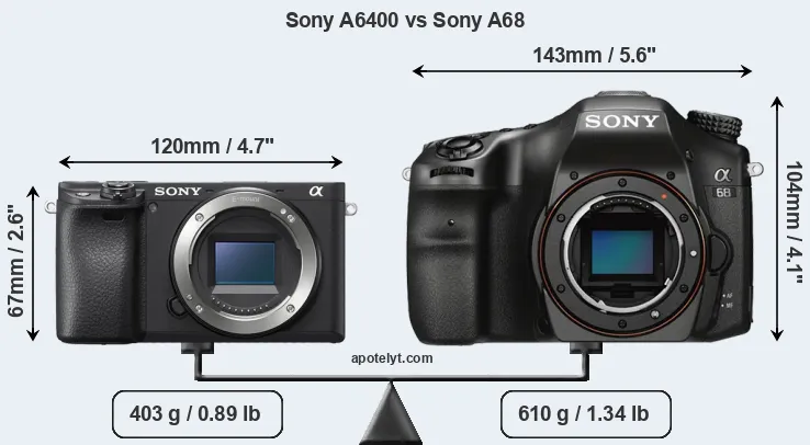 If the front view area (width x height) of the cameras is taken as an aggregate measure of their size, the Sony A68 is considerably larger (85 percent) than the Sony A6400. Moreover, the A68 is substantially heavier (51 percent) than the A6400. It is worth mentioning in this context that the A6400 is splash and dust resistant, while the A68 does not feature any corresponding weather-sealing.