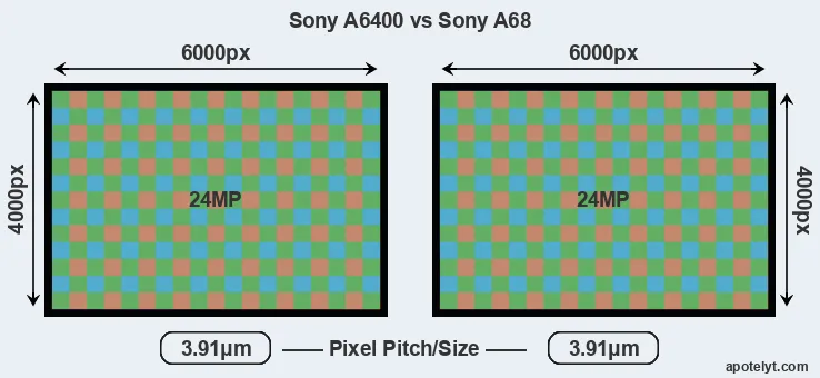 The two cameras under review do not only share the same sensor size, but also offer an identical resolution of 24 megapixels. This similarity in sensor specs implies that both the A6400 and the A68 have the same pixel density, as well as the same pixel size. It should, however, be noted that the A6400 is much more recent (by 3 years and 2 months) than the A68, and its sensor will have benefitted from technological advances during this time.