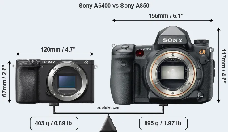 An illustration of the physical size and weight of the Sony A6400 and the Sony A850 is provided in the side-by-side display below. The two cameras are presented according to their relative size. Three successive views from the front, the top, and the rear are shown. All width, height and depth dimensions are rounded to the nearest millimeter.