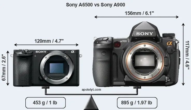 An illustration of the physical size and weight of the Sony A6500 and the Sony A900 is provided in the side-by-side display below. The two cameras are presented according to their relative size. Three successive views from the front, the top, and the rear are shown. All width, height and depth dimensions are rounded to the nearest millimeter.