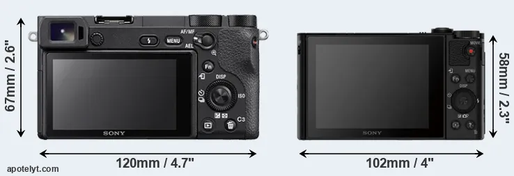 The side-by-side display below illustrates the physical size and weight of the Sony A6500 and the Sony HX80. The two cameras are presented according to their relative size. Three consecutive views from the front, the top, and the rear side are shown. All width, height and depth dimensions are rounded to the nearest millimeter.