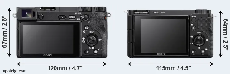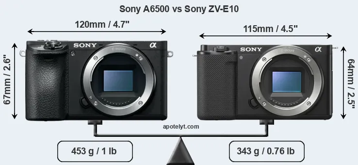 An illustration of the physical size and weight of the Sony A6500 and the Sony ZV-E10 is provided in the side-by-side display below. The two cameras are presented according to their relative size. Three consecutive perspectives from the front, the top, and the back are available. All width, height and depth measures are rounded to the nearest millimeter.