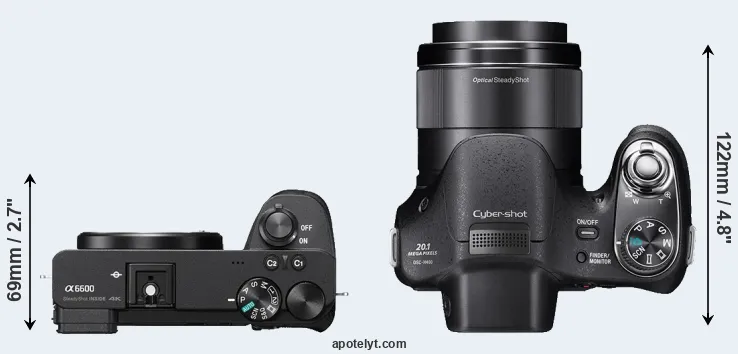 An illustration of the physical size and weight of the Sony A6600 and the Sony H400 is provided in the side-by-side display below. The two cameras are presented according to their relative size. Three successive views from the front, the top, and the rear are shown. All size dimensions are rounded to the nearest millimeter.
