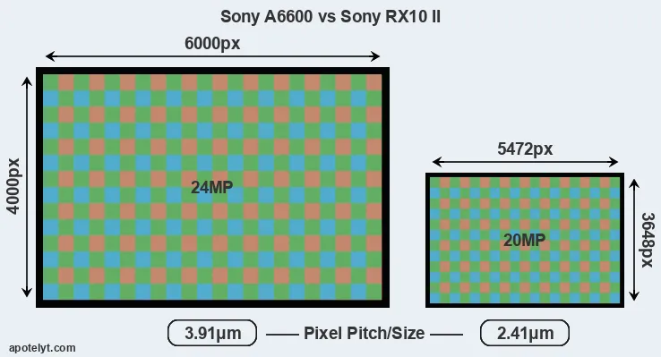 With 24MP, the A6600 offers a higher resolution than the RX10 II (20MP), but the A6600 nevertheless has larger individual pixels (pixel pitch of 3.91μm versus 2.41μm for the RX10 II) due to its larger sensor. Moreover, the A6600 is a much more recent model (by 4 years and 2 months) than the RX10 II, and its sensor will have benefitted from technological advances during this time that further enhance the light gathering capacity of its pixels.
