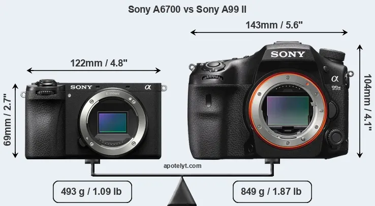 If the front view area (width x height) of the cameras is taken as an aggregate measure of their size, the Sony A99 II is considerably larger (77 percent) than the Sony A6700. Moreover, the A99 II is substantially heavier (72 percent) than the A6700. In this context, it is worth noting that both cameras are splash and dust-proof and can, hence, be used in inclement weather conditions or harsh environments.