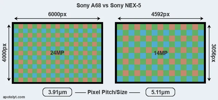 With 24MP, the A68 offers a higher resolution than the NEX-5 (14MP), but the A68 has smaller individual pixels (pixel pitch of 3.91μm versus 5.11μm for the NEX-5). However, the A68 is a much more recent model (by 5 years and 5 months) than the NEX-5, and its sensor will have benefitted from technological advances during this time that enhance the light gathering capacity of its pixels.
