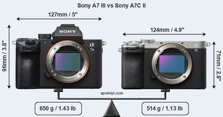The physical size and weight of the Sony A7 III and the Sony A7C II are illustrated in the side-by-side display below. The two cameras are presented according to their relative size. Three consecutive views from the front, the top, and the rear side are shown. All size dimensions are rounded to the nearest millimeter.