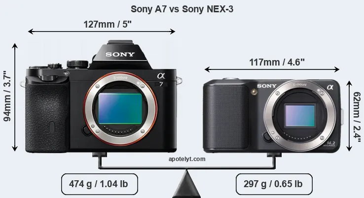 If the front view area (width x height) of the cameras is taken as an aggregate measure of their size, the Sony NEX-3 is considerably smaller (39 percent) than the Sony A7. Moreover, the NEX-3 is substantially lighter (37 percent) than the A7. It is worth mentioning in this context that the A7 is splash and dust resistant, while the NEX-3 does not feature any corresponding weather-sealing.
