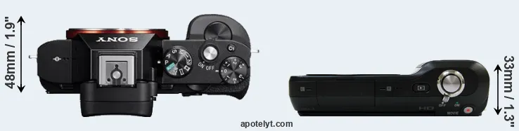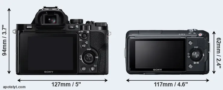 The physical size and weight of the Sony A7 and the Sony NEX-3 are illustrated in the side-by-side display below. The two cameras are presented according to their relative size. Three consecutive perspectives from the front, the top, and the back are available. All width, height and depth dimensions are rounded to the nearest millimeter.