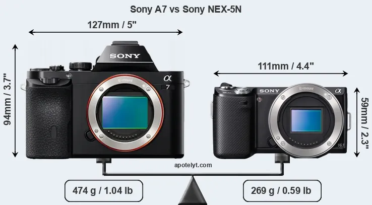 If the front view area (width x height) of the cameras is taken as an aggregate measure of their size, the Sony NEX-5N is considerably smaller (45 percent) than the Sony A7. Moreover, the NEX-5N is substantially lighter (43 percent) than the A7. It is worth mentioning in this context that the A7 is splash and dust resistant, while the NEX-5N does not feature any corresponding weather-sealing.