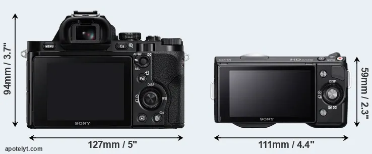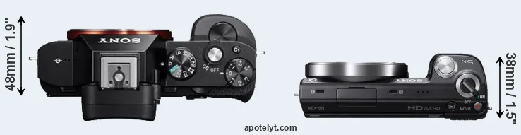 The physical size and weight of the Sony A7 and the Sony NEX-5N are illustrated in the side-by-side display below. The two cameras are presented according to their relative size. Three consecutive views from the front, the top, and the rear side are shown. All size dimensions are rounded to the nearest millimeter.