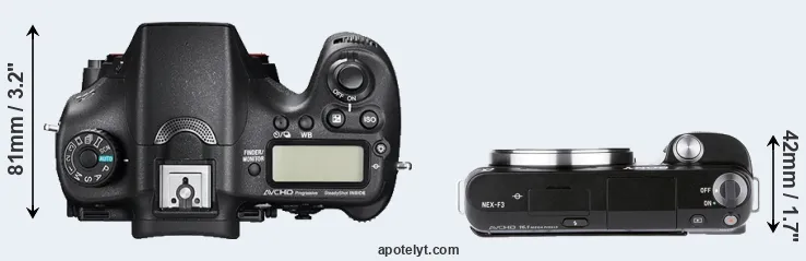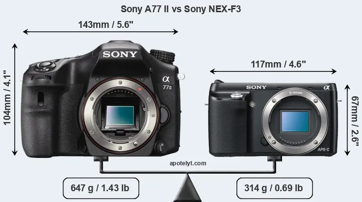 The side-by-side display below illustrates the physical size and weight of the Sony A77 II and the Sony NEX-F3. The two cameras are presented according to their relative size. Three consecutive perspectives from the front, the top, and the back are available. All width, height and depth measures are rounded to the nearest millimeter.