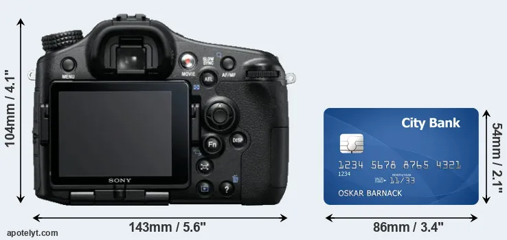 An illustration of the physical dimensions of the Sony A77 vis-à-vis a credit card is provided in the side-by-side display below. Three successive views from the front, the top, and the rear are shown. All width, height and depth dimensions are rounded to the nearest millimeter.