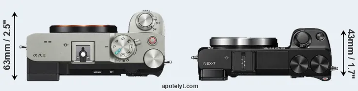 An illustration of the physical size and weight of the Sony A7C II and the Sony NEX-7 is provided in the side-by-side display below. The two cameras are presented according to their relative size. Three consecutive views from the front, the top, and the rear side are shown. All width, height and depth measures are rounded to the nearest millimeter.