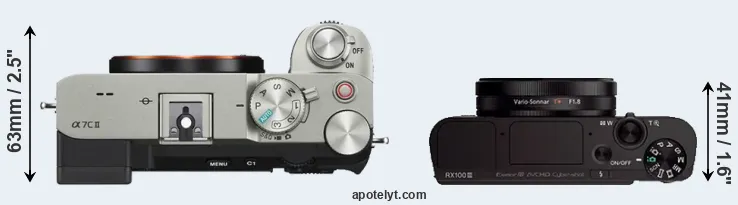 If the front view area (width x height) of the cameras is taken as an aggregate measure of their size, the Sony RX100 III is considerably smaller (33 percent) than the Sony A7C II. It is worth mentioning in this context that the A7C II is splash and dust resistant, while the RX100 III does not feature any corresponding weather-sealing.