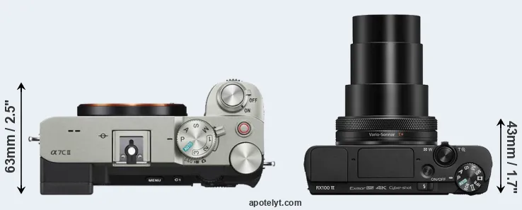 The physical size and weight of the Sony A7C II and the Sony RX100 VI are illustrated in the side-by-side display below. The two cameras are presented according to their relative size. Three consecutive views from the front, the top, and the rear side are shown. All width, height and depth measures are rounded to the nearest millimeter.