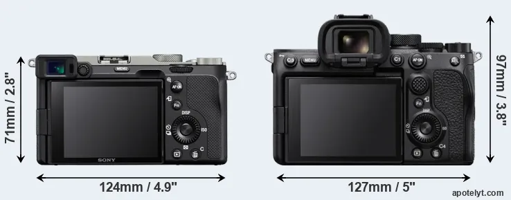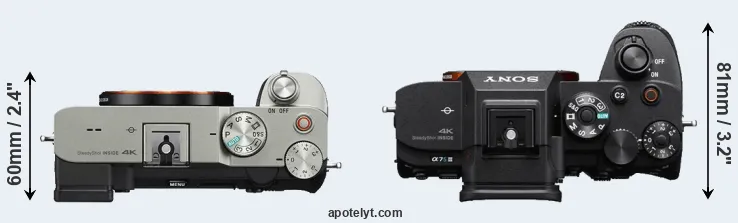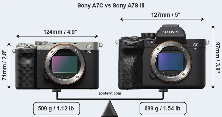 The physical size and weight of the Sony A7C and the Sony A7S III are illustrated in the side-by-side display below. The two cameras are presented according to their relative size. Three consecutive perspectives from the front, the top, and the back are available. All size dimensions are rounded to the nearest millimeter.